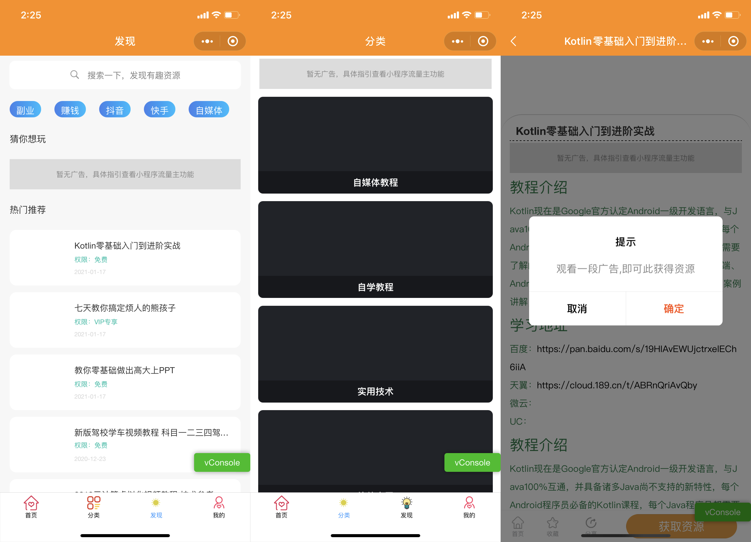 这个小程序是干什么的? 资源分享小程序为网络资源分享类自媒体解决变现与传播问题,小小的资源,要钱不合适,不要钱又不能用爰发电,让用户分享又没有效果,那么我们就可以让用户打开小程序,看一段广告,直接获取资源,是不是共赢呢? >适合我吗? 适合任何类型的资源分享,手机软件、图片素材、行业文档等等,你的任何互眹网资源都可以套用到本小程序,类型就是你的分享资源类型,小程序是个百搭的框架 >变现能力如何? 每页广告单独设置,高频率的插屏广告(收入超过激励视频),用户观看激励广告,用户解锁观看激励广告,只要你有定位精准的初始量,这个小程序的邀请解锁模式,会为你带来二次流量裂变,只要你的资源有价值,三次裂变四次